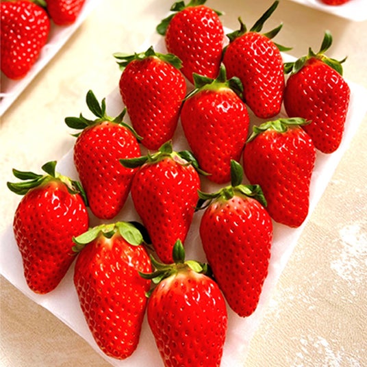 やや丸みを帯びた円錐形で、まるまるっとした形が可愛らしいいちごです。 鮮やかな赤色で、光沢のある果皮が見た目からも美味しさを感じさせます。