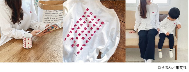 『りぼんふぉんと』を使ったデザインで、ロングスリーブTシャツや靴下などを制作しました。50音表が背中にプリントされたロングスリーブTシャツはキッズサイズも展開しており、お子さまの50音の勉強にも使えて、親子でのペアルックにもオススメです。ぜひ、親子でりぼん愛を深めるグッズとしてご覧ください。『りぼんふぉんと』はほかにも、スカーフや湯呑みとしても採用されております。
