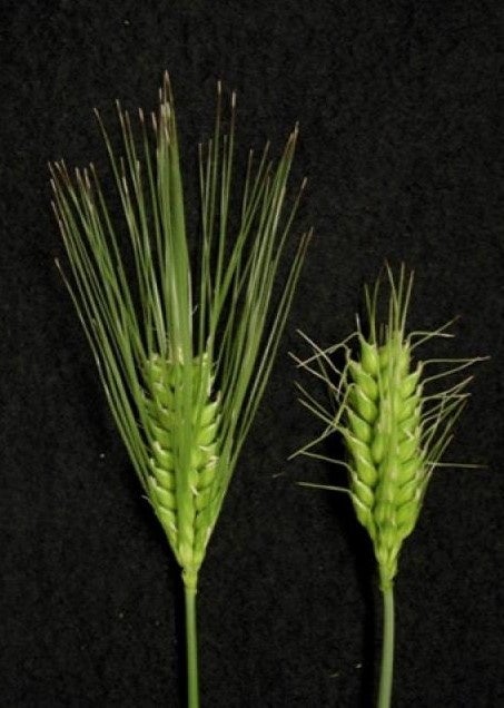 左:赤神力(正常型で長い芒を持つ)右:sca変異体(芒が短くて細く、先端が曲がる)