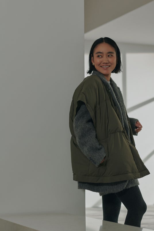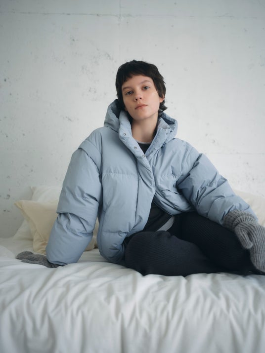 毎年人気のemmiのダウンジャケットに新作が登場!表地はリサイクルナイロン100%、そして詰め物にはリサイクルダウン(ダウン80%、フェザー20%)を使用しています。ダウンの混率がアップし、昨年よりもあたたかな着心地にアップデート。撥水加工を施しているので、どんな天気でも安心です。袖とフードは取り外し可能なので長いシーズン使えるほか、裾のドローコードを絞るとミドル丈からショート丈にも調整可能。1枚でいろんな着こなしができる、マンネリしないアウターです。