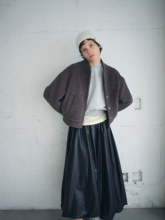 ポップコーンのような立体感が目を引く、インパクトのあるアウター。ウール糸をミックスした上品な生地なのでシーンを選ばず着られます。裾部分はゴム仕様にしているので、身ごろがゆったりしていてもスタイリッシュなルックに。
