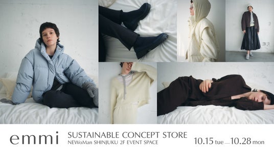 株式会社マッシュスタイルラボ(東京都千代田区/代表取締役社長 近藤広幸)が展開する、デイリーウェアおよびヨガウェアを手掛けるレディースブランド「emmi(エミ)」は、リサイクル素材や植物由来の素材を使用した商品を集積したサステナブルをコンセプトとしたポップアップストア「emmi SUSTAINABLE CONCEPT STORE」を、10月15日(火)から28日(月)までの期間中、ニュウマン新宿2階でイベントスペースで開催。毎シーズン好評のemmiのサステナブルマルチウェイダウンを先行発売いたします。