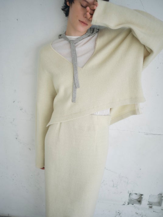 深いVネックが特徴的なプルオーバーと、セットアップでも着られる同じ素材のスカート。程よい起毛感と柔らかな風合い、そして伸縮性がポイントのリバージャージ。スカートのウエストはゴム仕様かつ、滑りの良い裏地つきでストレスフリーな着心地にこだわった1枚です。