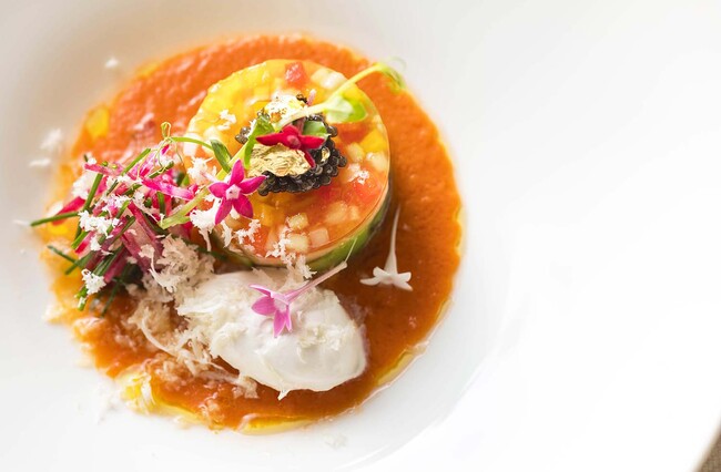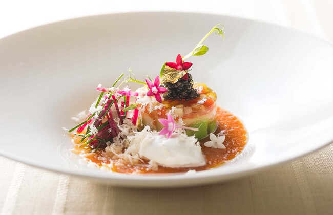 前菜で登場するのは、「ズワイガニとアボカドのガスパチョ キャビア添え クリスマス風」(写真)。アボカドとズワイガニ、カラフルな野菜のジュレを層にした味わい深い逸品です。レフォールを雪のように淡く散らした、燻製のレフォールクリームが味を引き締めつつ、甘酸っぱいリンゴのマリネと、キャビアの塩味もアクセントに。爽やかな酸味のガスパチョを、ソースのように絡めてお楽しみください。
