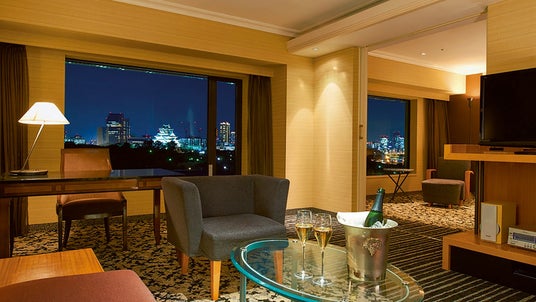 「プレミアム スイートステイプラン」では、会場でお愉しみいただけるシャンパーニュをご用意。ショーの後は、ライトアップされた大阪城と大阪市内の夜景を目の前に望む、60平方メートル の広々スイートでゆっくりお寛ぎいただけます。