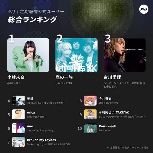2024年9月度の定期配信AWAラウンジランキングで1位に輝いたのは、トークと生演奏をラウンジで披露してくれているシンガーソングライター「小林未奈」。2位には、3ピースバンドの「鹿の一族」。3位に、シンガーソングライターの「古川愛理」がランクインしました。その他、“美根”、erica、ime、Broken my toybox、今井舞衣、今崎拓也、Rons weekが8月に引き続きランクインしました。