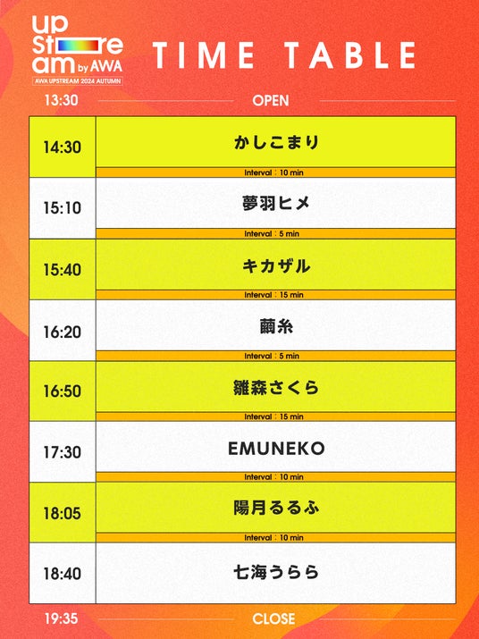 本日、七海うらら、陽月るるふ、かしこまり、AWAラウンジで活躍の人気配信者たちが出演する『AWA UPSTREAM 2024 AUTUMN』のタイムテーブルを発表いたしました。残りわずかとなりますがチケットの一般発売も開始いたしましたので、気になるアーティストをチェックして、ぜひ会場まで足をお運びください。
