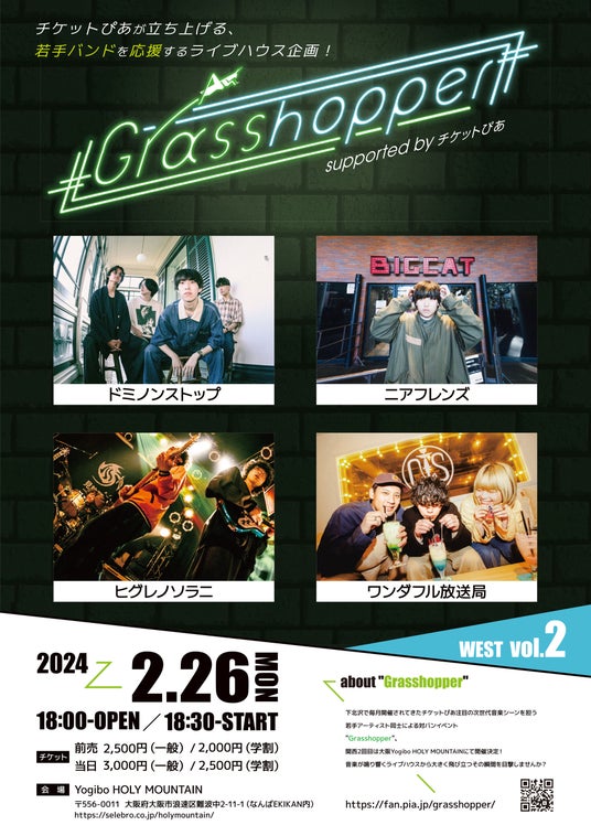 2月26日(月)にチケットぴあが主催する若手アーティストによる対バンイベント「Grasshopper supported by チケットぴあ」関西公演2回目の開催と、出演する4組のアーティストが解禁されました。