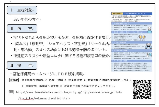 この度、東京iCDC専門家ボード感染制御チームでは、若い年代の方々に向けて、外出前に確認する項目や、「飲み会」「移動中」などの4つの場面における感染予防のポイントをまとめたチェックリストを作成しました。