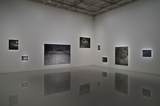風景の供養をテーマに、見知らぬ土地を歩き、踊り、風景の中に残された人々の営みを読み解く。本展では木炭画と映像、写真をゆるやかに接続しながら、色彩を失ったモノクロの空間に、時間をかけて紡いできた風景の物語を描いた。