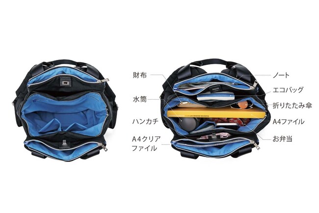 外側から、A4ファイルが入るファスナー付きスペース、エコバッグやタオルなどすぐ出したいものを入れるファスナーなしスペース、真ん中はまちの広いメインの部屋で、お弁当やポーチなどを入れるのにちょうどいいたっぷりスペースです。