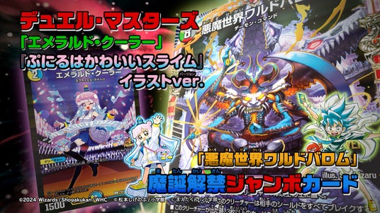 大人気カードゲームデュエル・マスターズからは2大カードふろく! アニメ大人気放送中「ぷにるはかわいいスライム」のまえだくん先生描き下ろしイラストが描かれた超レアカード「エメラルド・クーラー」と、「悪魔世界ワルドバロム」の魔誕解禁ジャンボカードを手に入れよう! 王道篇第4弾拡張パックがもらえる100名プレゼント銀はがしも!