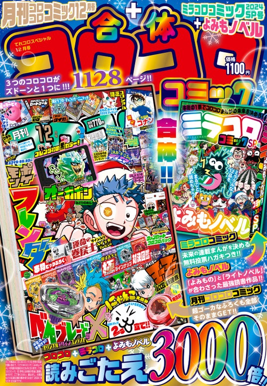 「月刊コロコロコミック」12月号、「ミラコロコミック」2024SP号、そして「よみもノベル」の3つが「合体」し、なんと1,128ページという激アツすぎる特別号! 「よみもノベル」は「よみもの」と「ライトノベル」がミックスした最強読書作品!読みごたえ3000倍のこちらも要チェック!
