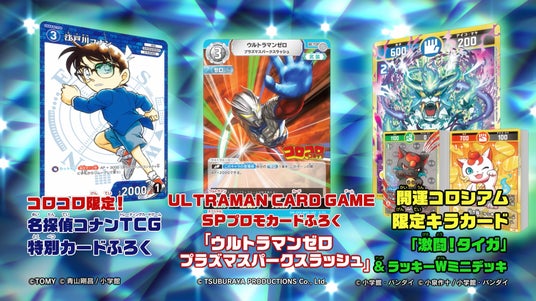 さらに! 話題のカードゲーム「名探偵コナントレーディングカードゲーム」のコロコロオリジナル「江戸川コナン」カードや、「ULTRAMAN CARD GAME」から“若き最強戦士”「ウルトラマンゼロ」カードも! 運値(うんち)のデカさで戦う「開運コロシアム」からは、限定キラカード「激闘!タイガ」&ラッキーWミニデッキと、最新2弾パック100名プレゼント銀はがしがふろく!