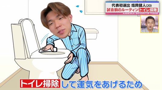 また「試合前にトイレ掃除を3回する」という習慣も披露。「掃除をすると運気が上がる」という一種のゲン担ぎから始めたと話し、自宅はもちろんスタジアムのトイレも掃除しているという塩貝選手に、スタジオからは驚きと称賛の声が上がりました。