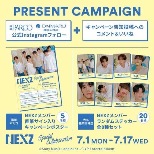 福岡PARCOと大丸福岡天神店は、JYPとソニーミュージックによる日韓合同オーディション・プロジェクト「Nizi Project Season 2」から誕生したグローバル・ボーイズグループ「NEXZ」とのコラボレーション・キャンペーンを開催いたします。
