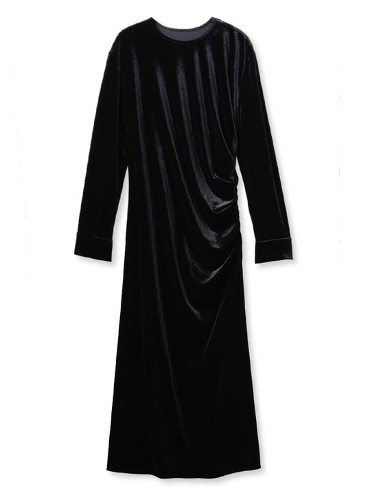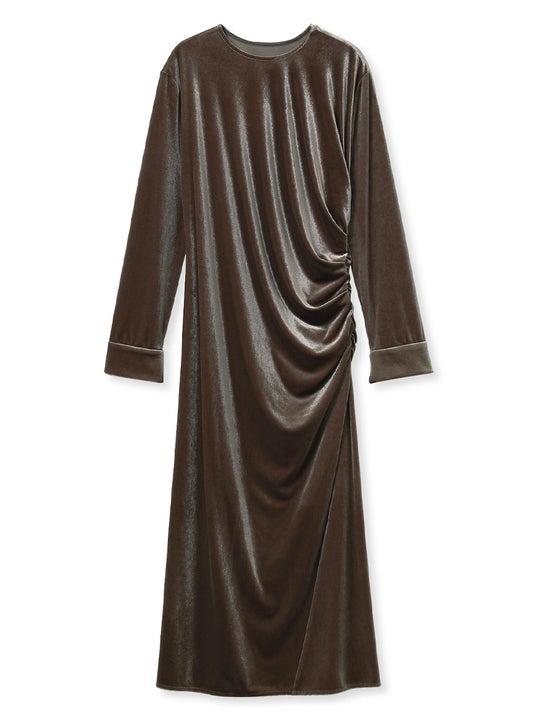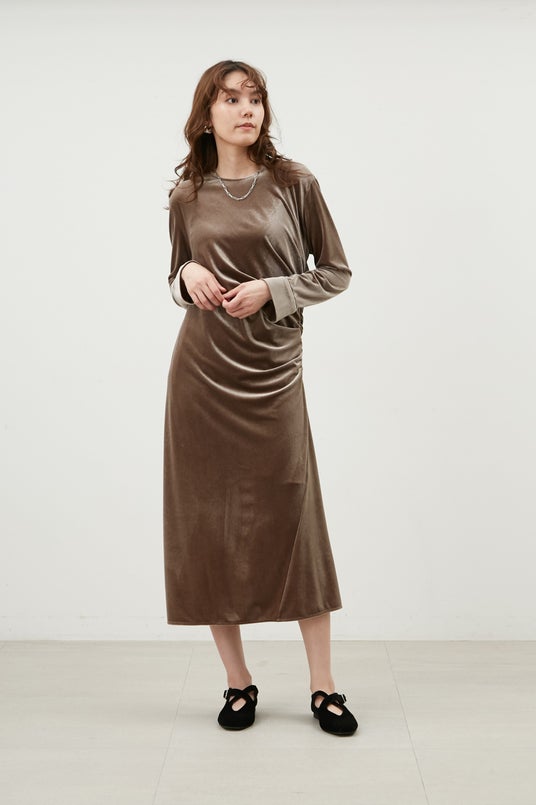 ウエスト部分にドレープデザインをいれ、体型カバーも叶うシルエットに。