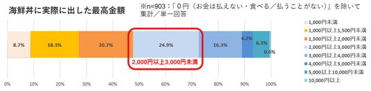 「海鮮丼」にかける予算を「実際に出した最高金額」と「出してもよい金額」についてそれぞれ聞いたところ、「実際に出した最高金額」で最も割合の高い価格帯は「2,000円以上3,000円未満」で24.9%でした。一方「出してもよい金額」では、「1,000円以上1,500円未満」が27.1%と最も高くなりました。「実際に出した最高金額」のほうが「出してもよい金額」より高い結果となりました。