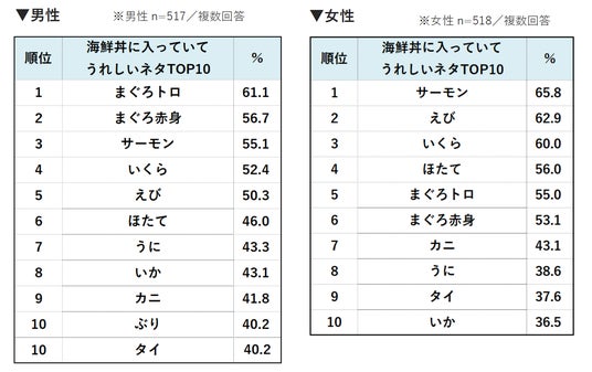 ■「海鮮丼」に入っていてうれしいネタは男女による違いが
