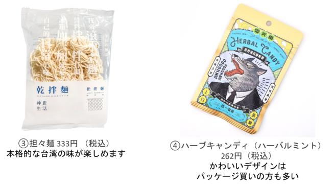 今回のポップアップストアでは、特に台湾らしい調味料や乾麺、お菓子やおつまみ、台湾茶、ドライフルーツ、はちみつなどを中心に約250~300品目を揃えています。どこかノスタルジックでレトロな雰囲気のかわいい台湾の生活雑貨も展開いたします。