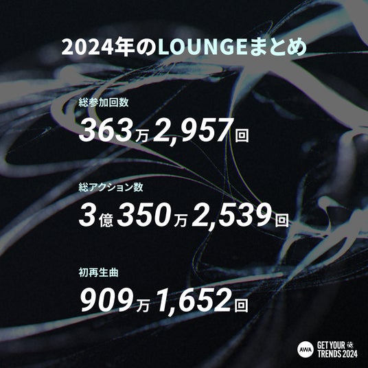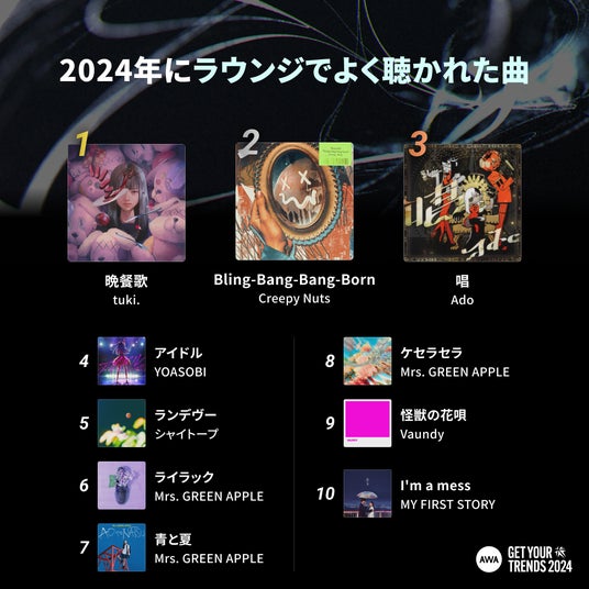 AWA株式会社(本社:東京都港区、代表取締役CEO:冨樫晃己)が運営する、サブスクリプション型(定額制)音楽ストリーミングサービス「AWA(アワ)」は、1年間※1)の「AWA」利用情報をユーザーごとに解析し、“自分だけの音楽史”を振り返ることができる特設サイト「GET YOUR TRENDS 2024」を2024年12月2日(月)に公開いたしました。また、これと併せて「AWA」全ユーザーの利用動向をまとめた年間ランキングも発表いたしました。