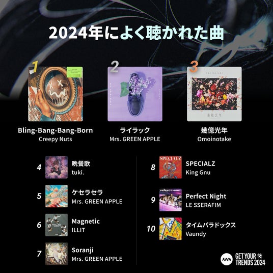 の「Bling-Bang-Bang-Born」。アニメの話題と共に楽曲の再生回数も上がり、オープニングムービーに合わせた通称“BBBBダンス”がTikTokなどで大流行しました。こちらはAWAでお気に入りされた楽曲の年間1位も獲得しており、幅広い層のユーザーを魅了しました。2位には、テレビ東京系アニメ『忘却バッテリー』のオープニングテーマとしてメガヒットを記録したMrs. GREEN APPLEの「ライラック」が輝き、アーティスト単位ではAWAリスナーZ世代において年間再生数1位を記録しています。3位に輝いたのは、TBS系火曜ドラマ『Eye Love You』主題歌として書き下ろされたOmoinotakeの「幾億光年」。その他にも、Billboard Japan Hot 100で首位を獲得し話題となったシンガーソングライターtuki.の「晩餐歌」や、朝日放送テレビ・テレビ朝日系連続ドラマ『日曜の夜ぐらいは…』の主題歌として書き下ろされたMrs. GREEN APPLEの「ケセラセラ」など、2024年に話題となった楽曲がトップ10に名を連ねています。この続きは、100位まで収録したプレイリストでお楽しみください。