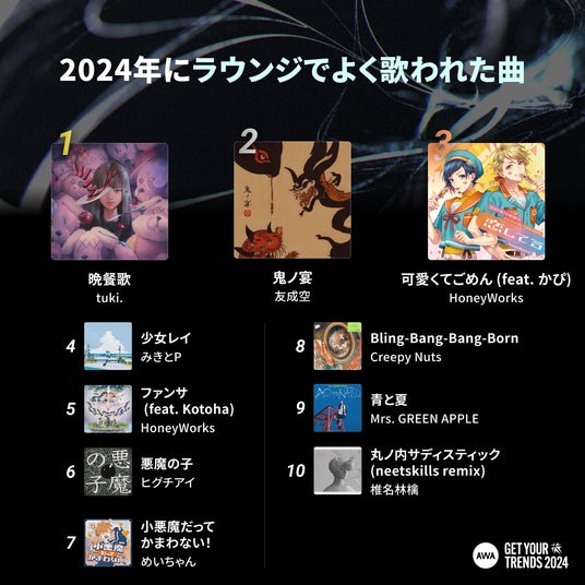 ラウンジで活動する歌い手が配信の中で歌唱した楽曲ランキングを発表。2024年にラウンジでよく歌われた曲&聴かれた曲の両方で見事1位に輝いたのは、tuki.の「晩餐歌」でした。2位は、オリコン週間ストリーミングランキングにおいて累積再生数1億を突破した新鋭アーティスト、友成空の「鬼ノ宴」が獲得。3位には昨年同様、HoneyWorksが手掛けTikTokを中心に大ヒットを記録した「可愛くてごめん (feat. かぴ)」がランクイン。その他、根強い人気を誇るみきとP「少女レイ」や、幅広い年齢層から支持を得たCreepy Nutsの「Bling-Bang-Bang-Born」など、バラエティに富んだ楽曲がランクインしています。