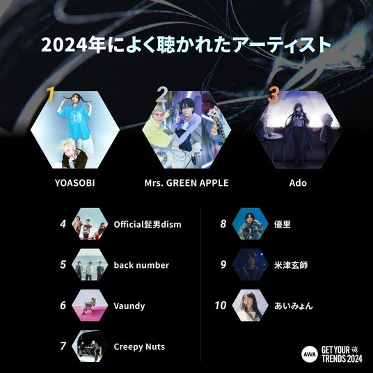 2024年に「AWA」で最も再生回数の多かったアーティスト1位には、今年『Coachella Valley Music and Arts Festival 2024』出演&初のアメリカ単独公演を果たしたYOASOBIが輝きました。2位には、年間楽曲ランキング2位の「ライラック」を筆頭に、映画『ディア・ファミリー』主題歌である「Dear」や第33回オリンピック競技大会のテレビ朝日系中継を盛り上げる『テレビ朝日系列 2024スポーツ応援ソング』として起用された「アポロドロス」など、多くのタイアップ曲をリリースしたMrs. GREEN APPLEがランクイン。3位には、メジャーデビューから3年半のスピードで女性ソロアーティスト史上初となる国立競技場でのワンマンライブを開催する他、アイドルグループのプロデュースなど2024年も話題の多かったAdoが輝いています。その他にも、メジャー3rdアルバム『Rejoice』のリリースやアリーナツアーの開催など、精力的に活動を行ったOfficial髭男dismが4位ランクイン。