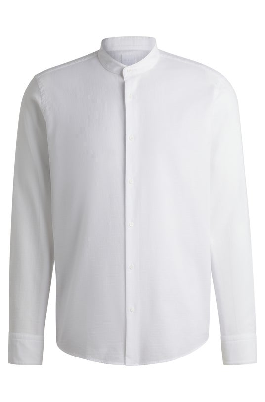 shirts繊細に織られたノーカラーシャツは、平日にも使いやすい一着。柔らかなコットンでストレートフィットにカットされています。