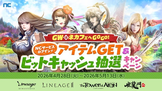 『リネージュ』『リネージュ2』『タワー オブ アイオン』などのPC向けオンラインゲームや、『リネージュM』『雀龍門M』などモバイルゲームをサービス中のエヌ・シー・ジャパン株式会社(東京都港区、代表取締役:林 元基(イム ウォンキ)、以下エヌシージャパン)は、「NCサービスログインでアイテムGET&ビットキャッシュ抽選キャンペーン」の開始をお知らせします。