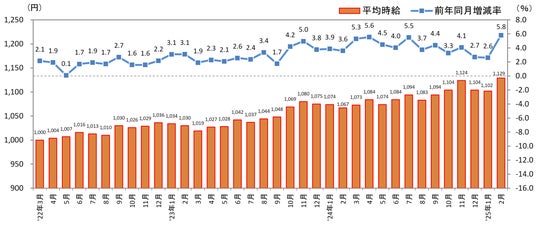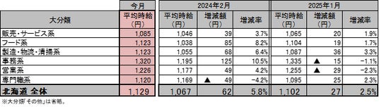 北海道の2月度平均時給は前年同月より62円増加の1,129円