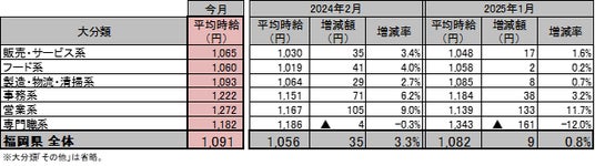 - 職種別前年同月比:「事務系」(増減額+71円、増減率+6.2%)、「フード系」(同+41円、+4.0%)など5職種でプラス