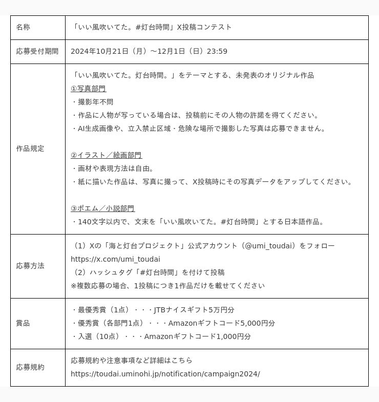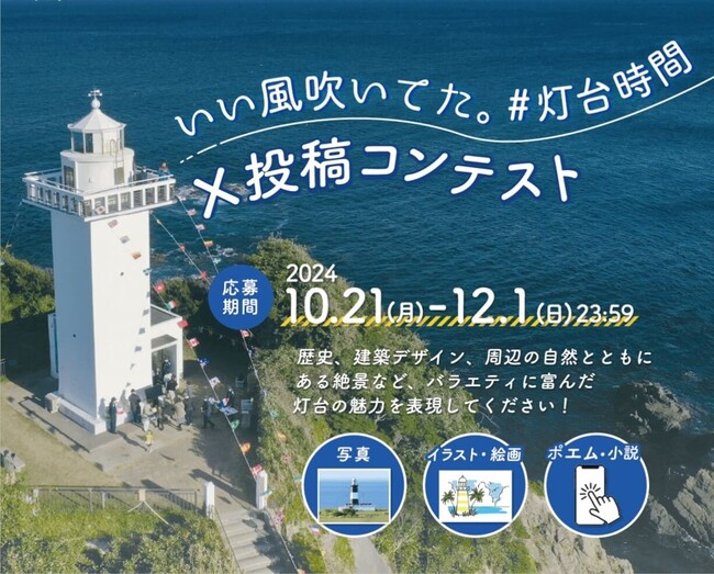 日本財団「海と灯台プロジェクト」を運営する(一社)海洋文化創造フォーラムは、「海と灯台ウィーク(11月1日~8日)」を機に、多くの人に灯台に思いを馳せてほしいとの願いを込めて【「いい風吹いてた。#灯台時間」X投稿コンテスト】を実施します。歴史、建築デザイン、周辺の自然とともにある絶景など、バラエティに富んだ灯台の魅力を表現し、灯台を素敵だと感じさせる作品を3部門(1.写真、2.イラスト/絵画、3.ポエム/小説)で募集。優秀作品に選ばれた方には、豪華賞品を進呈します。応募期間は2024年10月21日(月)~12月1日(日)23:59までとなります。