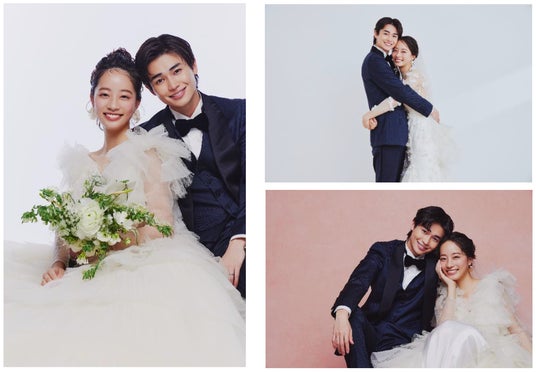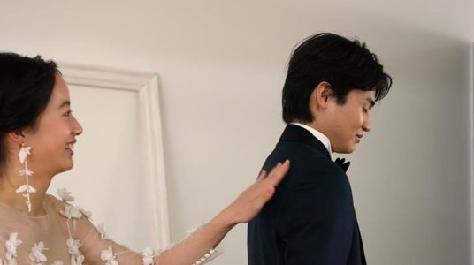 撮影前から「ドレスを着られるのが楽しみです」と話していた池端さん。この日実際に袖を通してみて、「ずっとにやにやしてしまいます。すごくかわいくて、鏡の前で何回も見てしまいました」と満面の笑みを見せてくれました。「初めてウエディングドレスを着ましたが、背筋も伸びて身も心も引き締まって、本当に自分にパワーをくれる特別な一着なんだと実感しました」。そしてタキシードに着替えた西垣さんとの“ファーストミート”では、背を向けて待つ西垣さんの肩をたたいて振り返ってもらいます。その瞬間、「めっちゃきれい! すてき! かわいい!」と口にする西垣さんに、池端さんは「かっこいいです…」と照れくさそうに小声でお返ししていました。