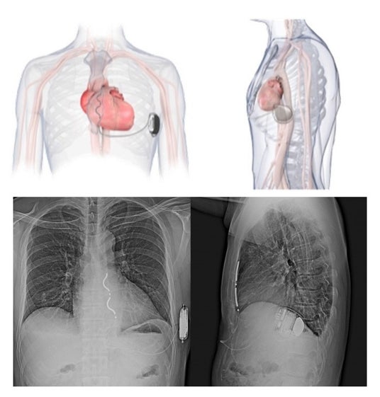 上図:デバイス植え込みのイメージ図。本体は心尖部と中腋窩線が交わるところに植え込まれ、リードはみぞおちから胸骨下の縦隔内に植え込まれる。下図:デバイス植込み後の胸部X線画像。