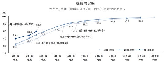 就職内定率は58.7%で、前年同時期に比べ8.9ポイント高い。内定取得者のうち、2社以上内定を取得したことがある学生の割合は53.5%と前年より増加