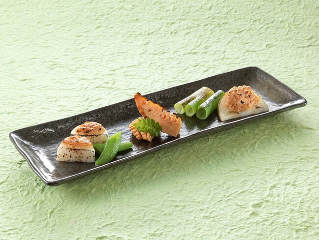本コースでは、柔らかく甘みを感じられる春野菜の旨味、彩りを活かした料理をご用意します。淡路産の筍、春若芋や新玉葱など、春の味覚を主役にした焼物は、兵庫県但馬産ホタルイカと厳選素材から作られた魚醤や、淡路島の山間に位置する仁井地区の麹味噌「保地(ほじ)味噌」を合わせて香ばしく焼き上げました。なかでも、この時期にしか味わえない柔らかな新葉付きの新玉葱は、火を入れることで甘みが濃くなり絶品です。瑞々しい春野菜の美味しさを存分にご堪能ください。