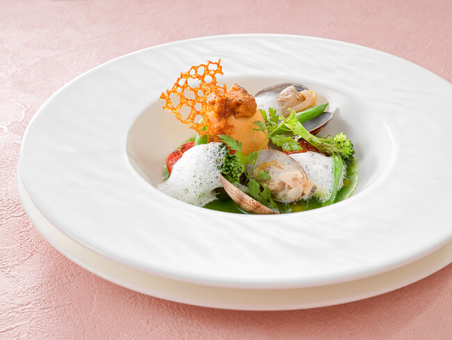 ファンダイニング「コッコラーレ」スペシャリテでご提供する地中海フレンチの前菜は、濃厚で口溶けなめらかな雲丹のフランと蒸したアサリに、法蓮草のソースとアサリの風味が香る泡ソースを合わせ、素材の鮮やかな色合いに春の訪れを感じられる一皿です。スープは、玉葱の旨みを凝縮させたブルーテで、瑞々しく味が濃い新玉葱の美味しさを閉じ込めました。
