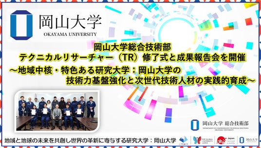国立大学法人岡山大学(本部:岡山市北区、学長:那須保友)技術統括監理本部を構成する組織のひとつである総合技術部は2025年3月13日、本学津島キャンパスの環境理工棟大会議室において、テクニカルリサーチャー(TR)4人の修了式と成果報告会を開催しました。