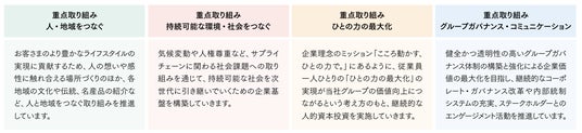 三越伊勢丹グループは、事業活動を通じて社会課題の解決に寄与しながら、持続的に企業価値を高めていくことを目指し、サステナビリティ経営の強化に努めています。サステナビリティ経営においては、目指す姿の実現に向け4つの重点取り組み(マテリアリティ)を定め、これらの取り組みを各事業戦略と一体となり推進しています。