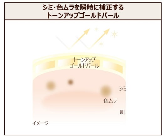 ◆トーンアップゴールドパール配合。シミ・色ムラ&影をカバーし、肌を明るく、立体的なハリ感を演出する「3Dトーンアップ処方」を採用。