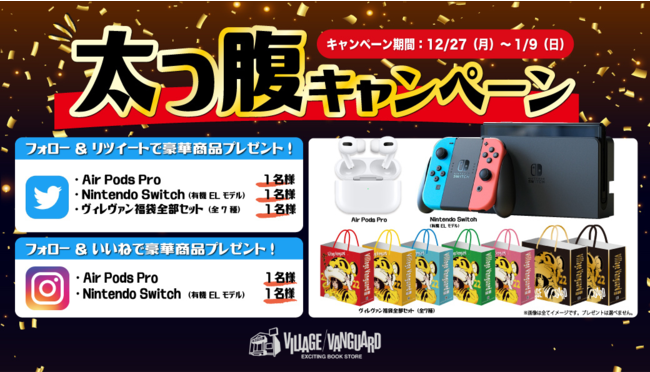 株式会社ヴィレッジヴァンガードコーポレーション(所在地:愛知県名古屋市、代表取締役社長:白川篤典)では、2021年12月27日(月)より公式TwitterとInstagramにおいて、『太っ腹キャンペーン』を開始いたしました。