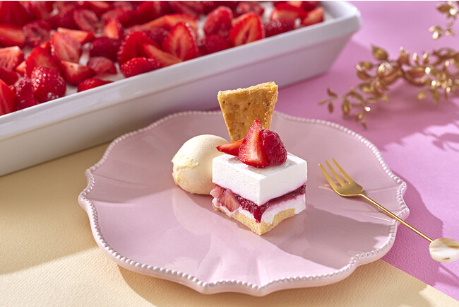 実演コーナーでは、純白のマスカルポーネクリームに、真っ赤な苺とフランボワーズが映える「アニバーサリートライフル」をご用意。目の前でお取り分けし、ミルクの風味豊かなバニラアイスクリームとベリーを添えてご提供します。