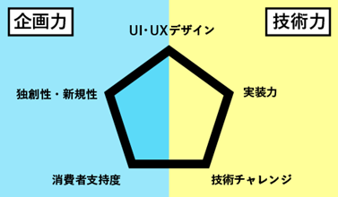 企画した内容を実現できているか、動作の安定性、機能の充実など、企画に対して技術的に完成度が高い作品になっているか、実現に適した技術を使用できているか