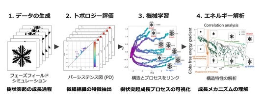 東京理科大学先進工学部マテリアル創成工学科の小嗣 真人教授、岡山大学の大林 一平教授、京都大学の平岡 裕章教授らの研究グループは、トポロジーと自由エネルギーを活用した機械学習(AI)解析を実施し、薄膜結晶の電気的特性に大きな影響を与える樹枝状構造の枝分かれメカニズムを明らかにしました。これは、高品質な薄膜結晶の作製プロセスにつながる成果であり、次世代の電子デバイスへの応用が期待されます。