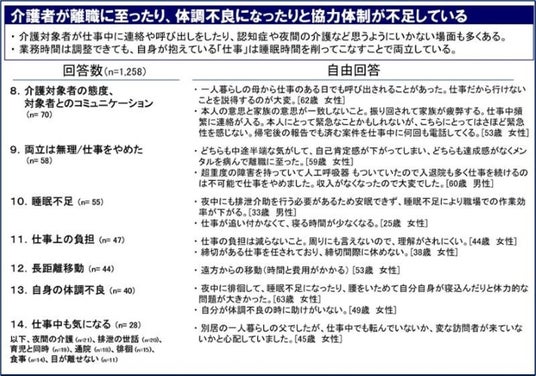 2:「介護対象者への対応と仕事の狭間で調整が難しい」「睡眠時間を削る」「離職した」