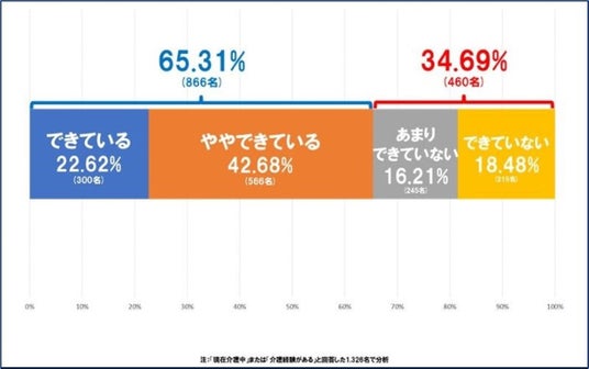 「仕事と介護を両立できている(両立できた)と考えていますか?」という質問に対し、「できている」「ややできている」と回答した割合は65.31%、「あまりできていない」「できていない」と回答した割合は34.69%でした(図3)。介護に携わる人の約35%が仕事と介護の両立に困難を抱えている現状が浮き彫りになりました。これは、社会課題として考えていく必要がありそうです。