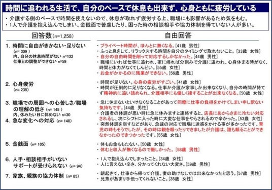 「仕事と介護の両立で大変だったことや困ったことはどんなことですか」という質問に対しては、自由記述で多数の回答が寄せられました(1,258名回答)。