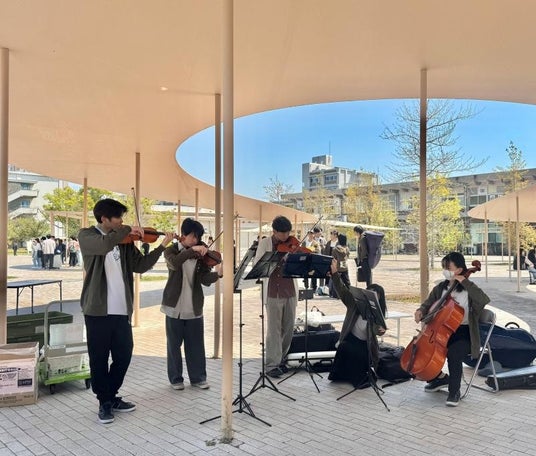 活動内容について紹介するチラシ配布だけでなく、昼休みには、ピーチユニオン、保健管理センター、マスカットユニオン前で学生によるミニコンサートや演舞などのさまざまなイベントが行われています。4月17日の津島地区東キャンパスには、青空の下でJAZZ研究会と交響楽団による演奏を楽しむ学生の姿がありました。