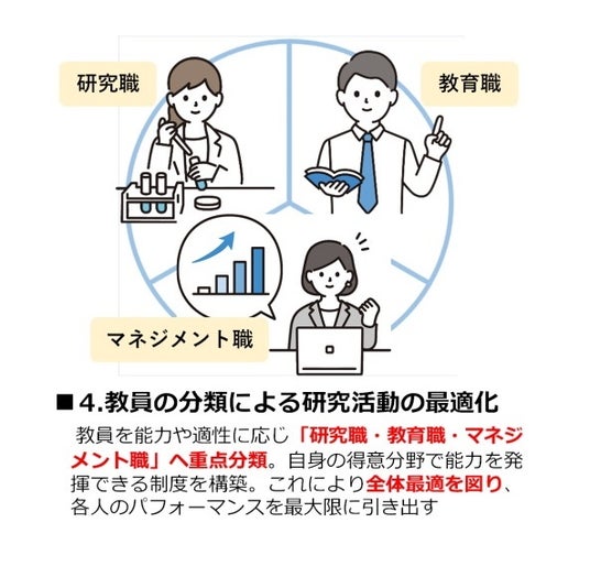わが国では、研究力・イノベーション創出強化を推進するにあたり、研究開発マネジメント人材の重要性が高まっており、文部科学省でも議論されています。本学も研究大学として、どの大学・研究機関よりも早くくURAを高度マネジメント人材として運用し、多くの実績を積み上げてきました。さらにJ-PEAKSでは、URA機能の内製化を図る「研究開発マネジメント人材の育成」を推進しています。研究大学として人的リソースの最適化を図る各種制度(研究・教育・マネジメントにおけるエフォート傾注による教員の機能分化)や複線型人事制度(採用時の職種に縛られることなく、能力や適性、希望により職種間の異動を可とする制度)の設計等を鋭意進めており、事務職員や技術職員、図書職員などの高度化は、これらの施策の実現に欠かせません。